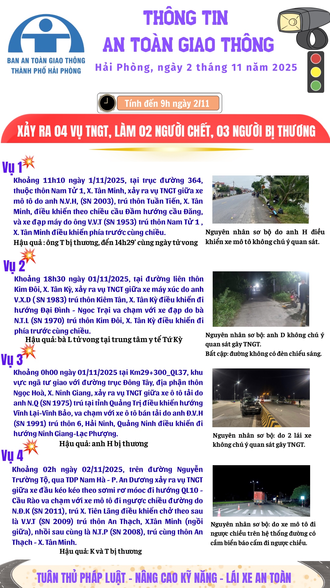 THÔNG TIN AN TOÀN GIAO THÔNG XẢY RA 04 VỤ TNGT, LÀM 02 NGƯỜI CHẾT, 03 NGƯỜI BỊ THƯƠNG