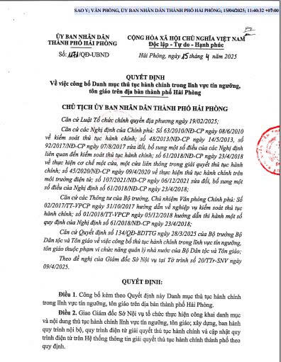 Quyết định công bố thủ tục hành chính lĩnh vực tín ngưỡng, tôn giáo trên địa bàn thành phố Hải Phòng