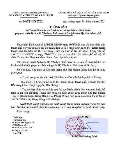 Thông báo của Sở Văn hóa, Thể thao và Du lịch thông báo về trụ sở làm việc và Danh Mục thủ tục hành chính thuộc phạm vi quản lý của Sở trên địa bàn thành phố Hải Phòng