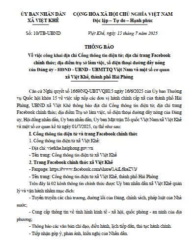 Thông báo về việc công khai địa chỉ Cổng thông tin điện tử; địa chỉ trang Facebook chính thức; địa điểm trụ sở làm việc, số điện thoại đường dây nóng của Đảng ủy - HĐND - UBND - UBMTTQ Việt Nam và một số cơ quan xã Việt Khê, thành phố Hải Phòng
