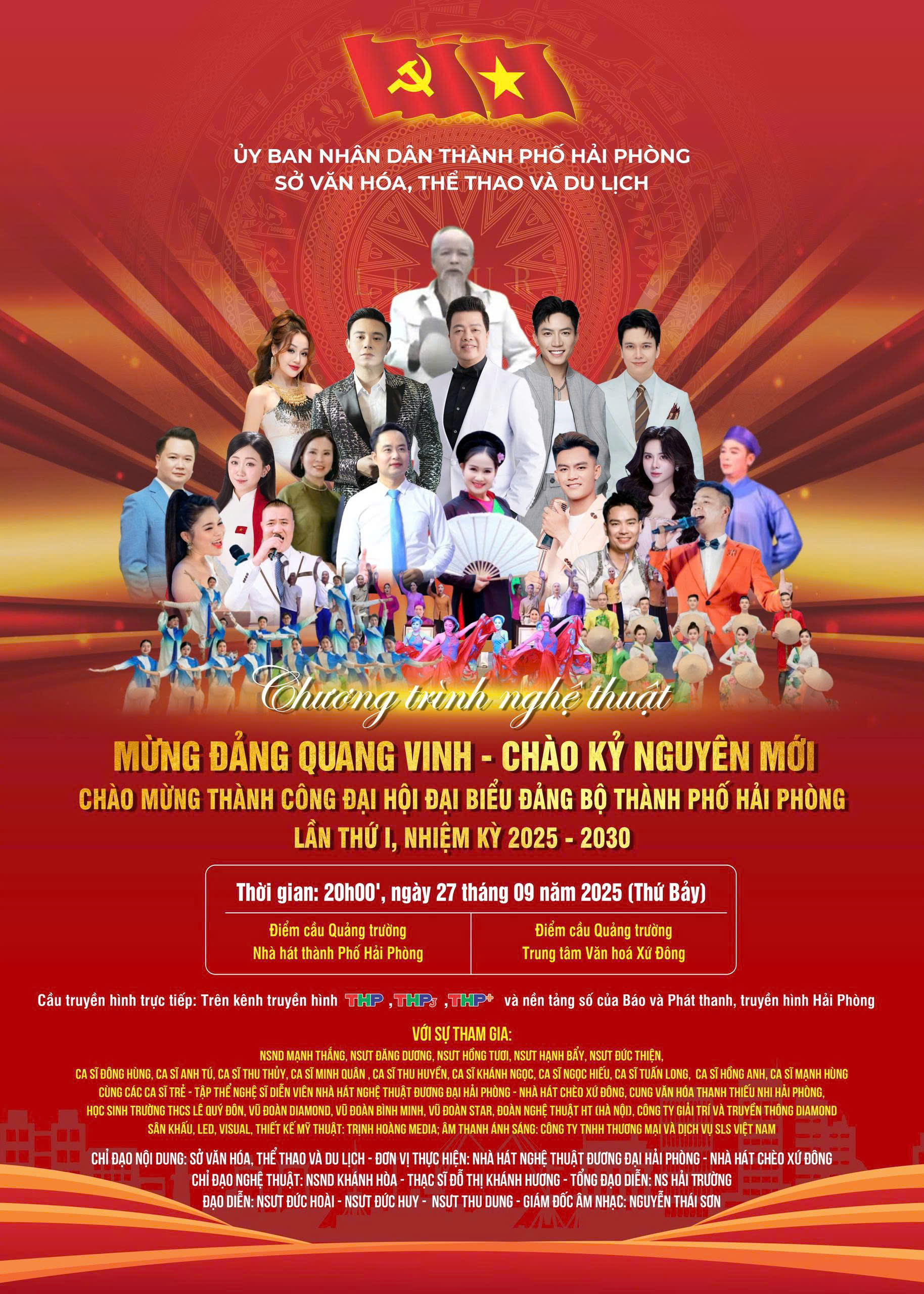 Chào mừng thành công Đại hội đại biểu Đảng bộ thành phố Hải Phòng lần thứ I, nhiệm kỳ 2025 – 2030, tối ngày 27/9/2025 (Thứ Bảy), tại Quảng trường Nhà hát thành phố Hải Phòng và Quảng trường Trung tâm Văn hóa Xứ Đông, Sở Văn hóa, Thể thao và Du lịch thành phố long trọng tổ chức chương trình nghệ thuật đặc biệt: