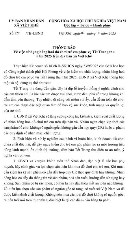 TRUNG THU AN TOÀN - NÓI KHÔNG VỚI ĐỒ CHƠI KHÔNG ĐẢM BẢO CHẤT LƯỢNG TẠI XÃ VIỆT KHÊ