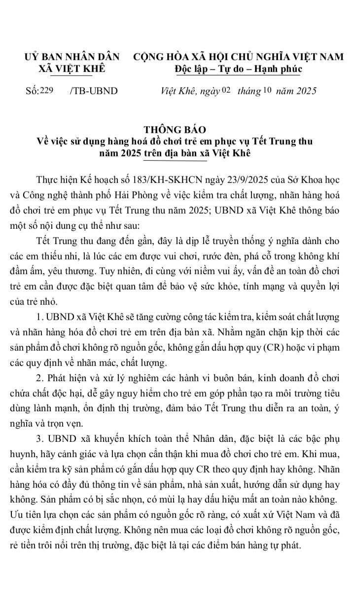 TRUNG THU AN TOÀN - NÓI KHÔNG VỚI ĐỒ CHƠI KHÔNG ĐẢM BẢO CHẤT LƯỢNG TẠI XÃ VIỆT KHÊ