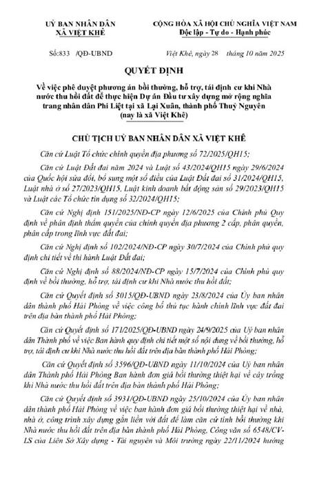 Quyết đinh số 833/QĐ-UBND ngày 28/10/2025 của UBND xã Việt Khê về việc phê duyệt phương án bồi thường, hỗ trợ, tái định cư khi Nhà nước thu hồi đất để thực hiện Dự án Đầu tư xây dựng mở rộng nghĩa trang nhân dân Phi Liệt tại xã Lại Xuân, thành phố Thuỷ Nguyên (nay là xã Việt Khê)
