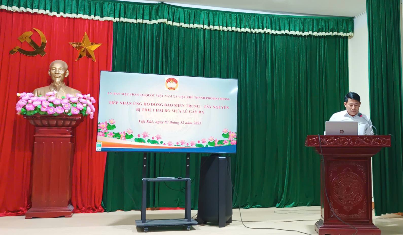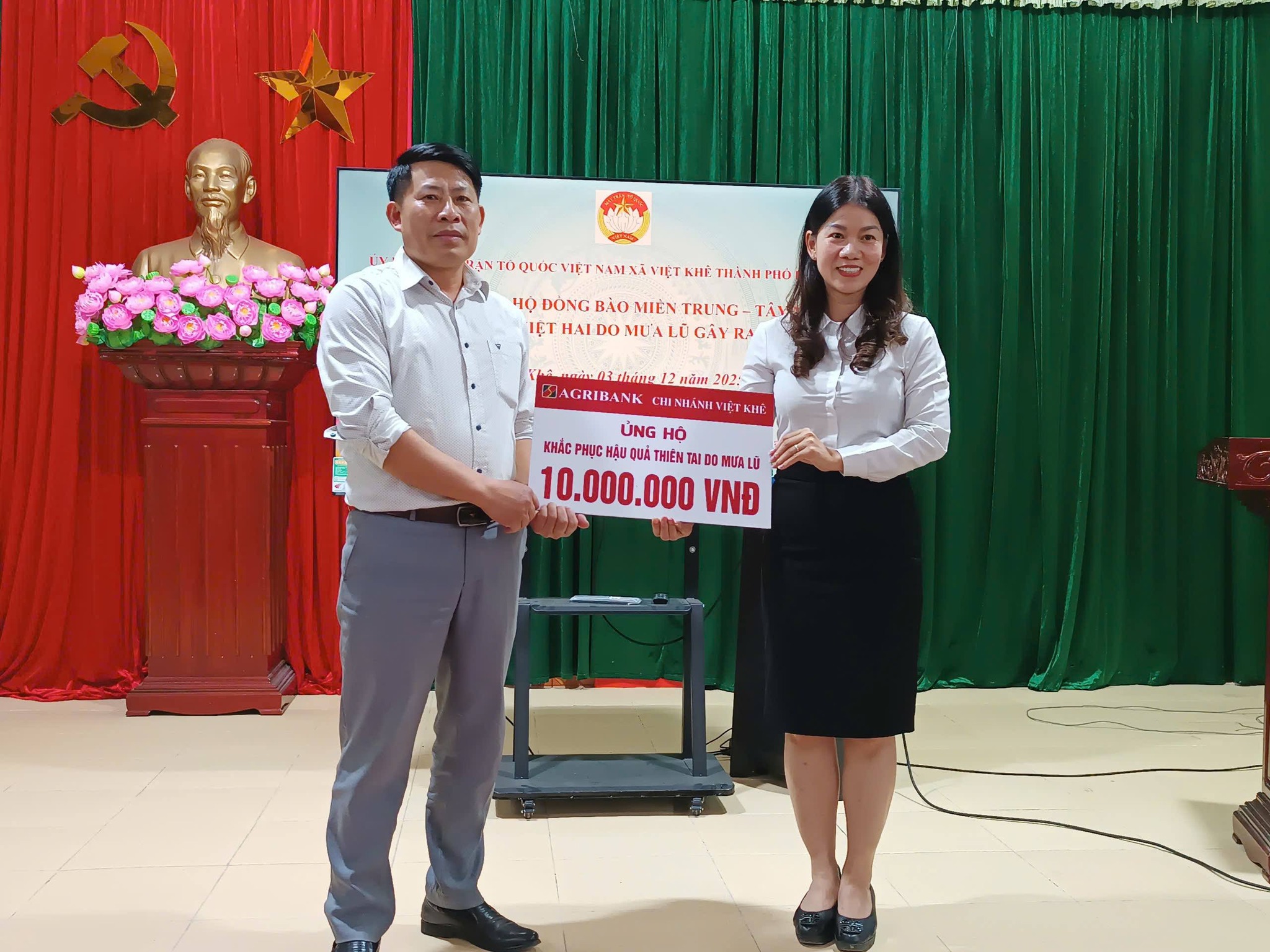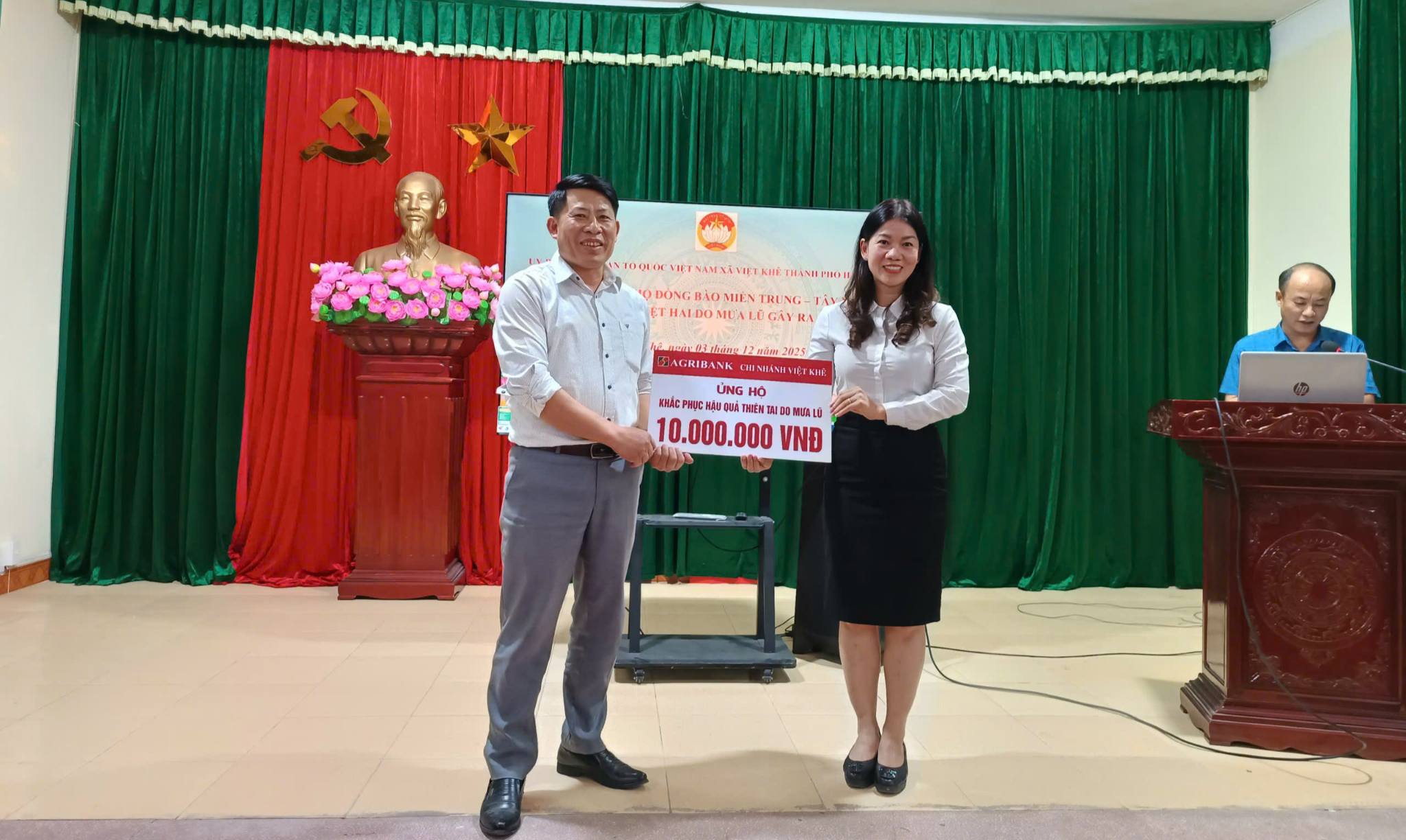 Tại buổi tiếp nhận, Đảng uỷ, HĐND, UBND, UBMTTQ Việt Nam xã Việt Khê trân trọng cảm ơn sự quan tâm, tinh thần tương thân tương ái và trách nhiệm cộng đồng của tập thể lãnh đạo, cán bộ, nhân viên Agribank chi nhánh Việt Khê Bắc Hải Phòng. Đây là nghĩa cử thiết thực, kịp thời góp phần chia sẻ khó khăn với nhân dân vùng bị ảnh hưởng mưa lũ.