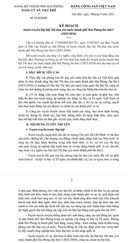 Kế hoạch số 16-KH/ĐU ngày 26/9/2025 của Đảng uỷ xã Việt Khê về việc tuyên tuyền Đại hội Thi đua yêu nước thành phố Hải Phòng lần thứ I (2025-2030)