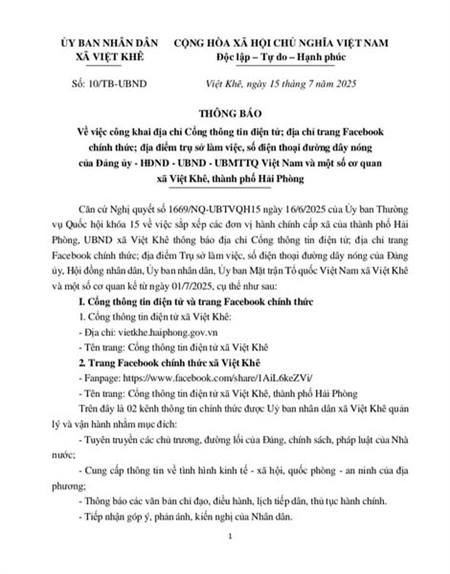 UBND xã thông báo về việc công khai địa chỉ Cổng thông tin điện tử; địa chỉ trang Facebook chính thức; địa điểm trụ sở làm việc, số điện thoại đường dây nóng của Đảng uỷ -HĐND-UBND-UBMTTQ Việt Nam xã và một số cơ quan xã Việt Khê
