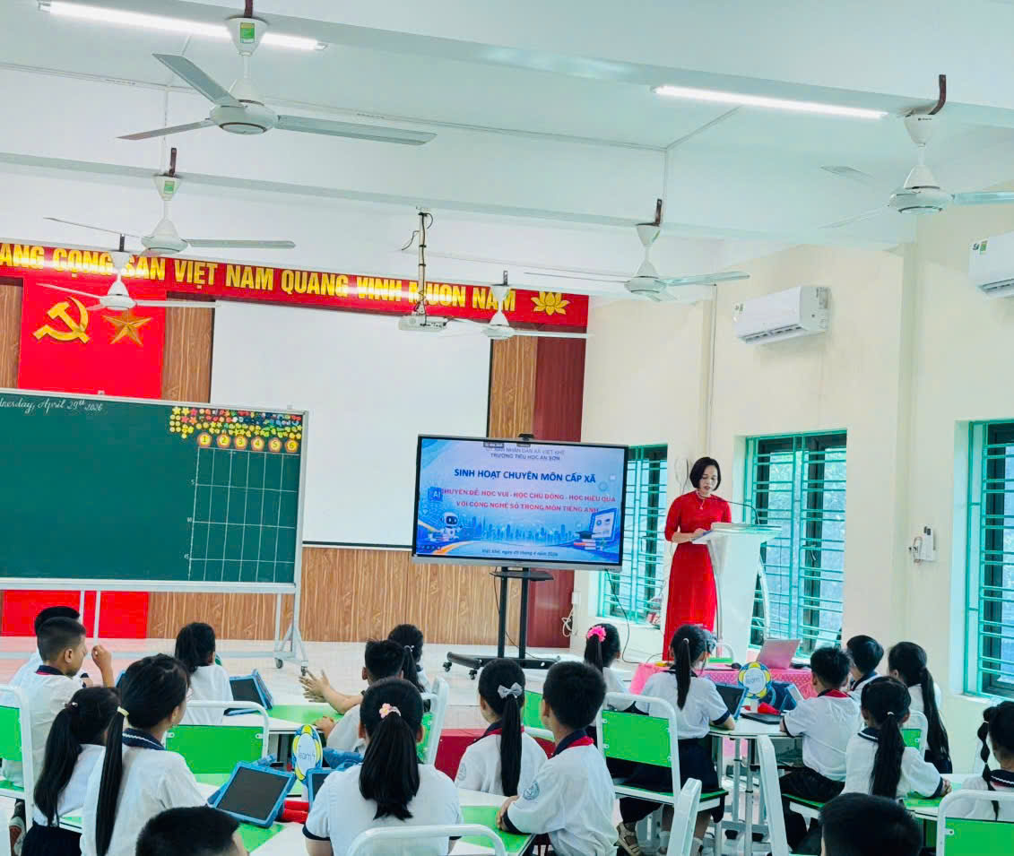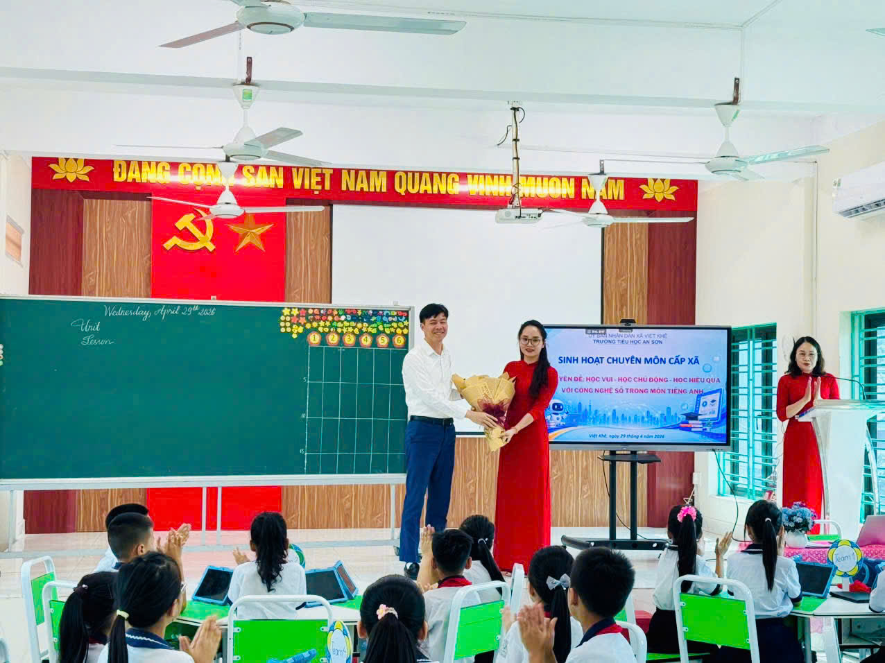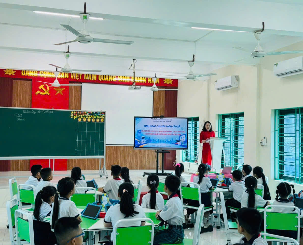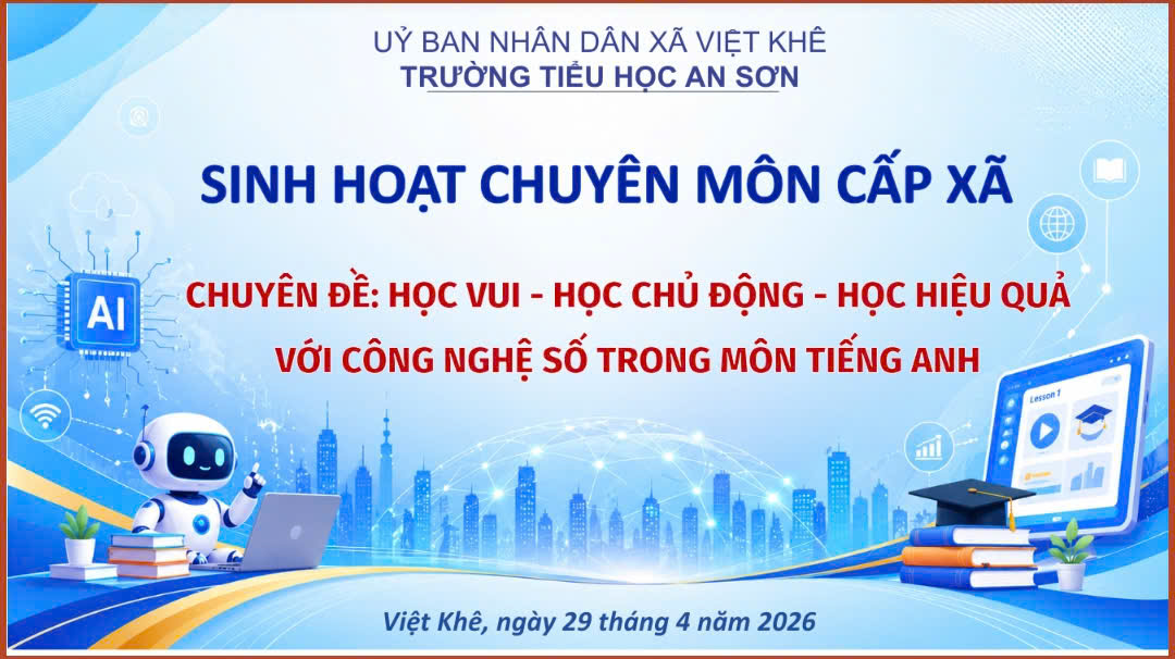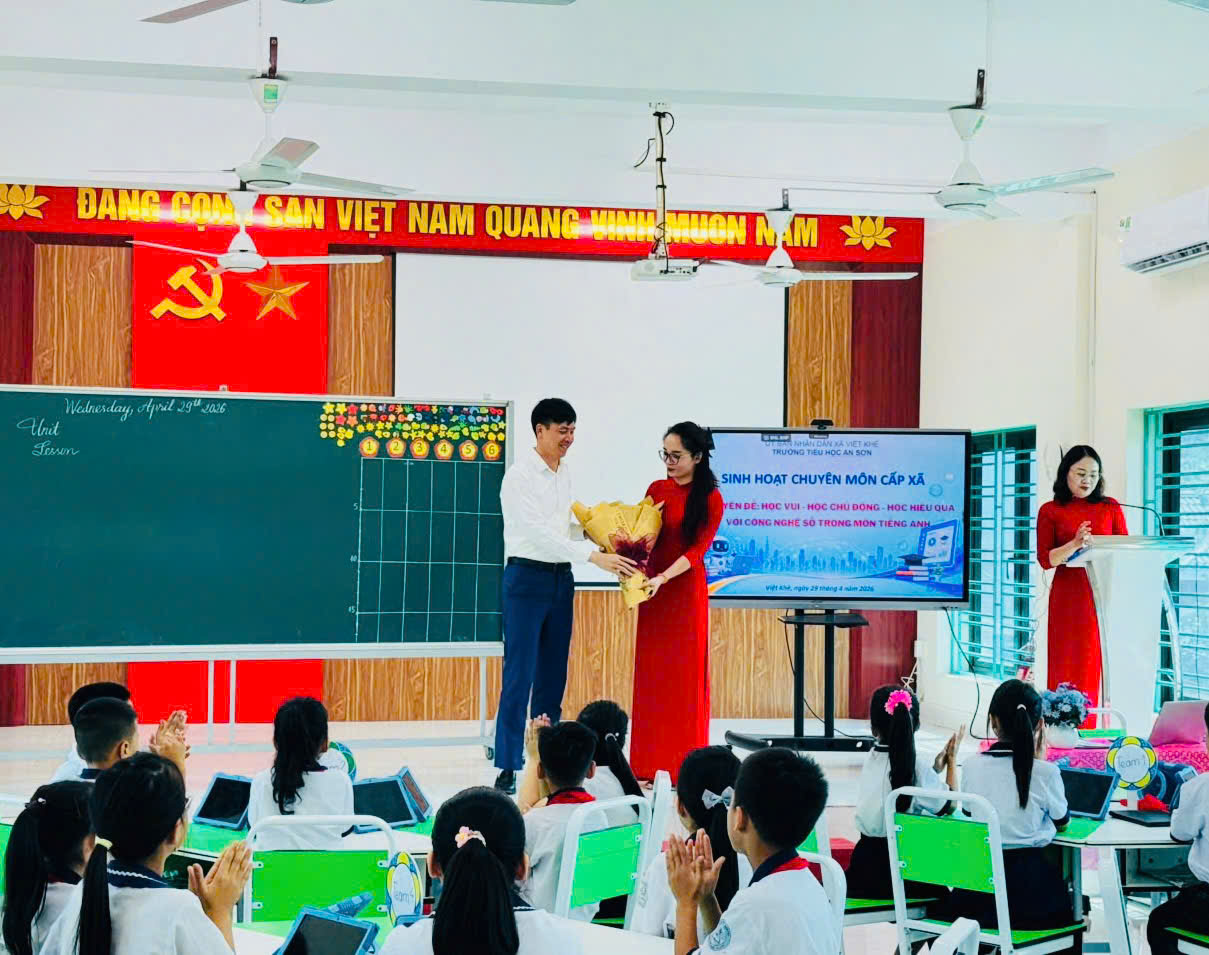 Chiều ngày 29/4/2026, tại Trường Tiểu học An Sơn, xã Việt Khê đã diễn ra buổi sinh hoạt chuyên môn cấp xã môn Tiếng Anh với chủ đề **“Học vui - Học chủ động - Học hiệu quả với công nghệ số trong môn Tiếng Anh”** trong không khí nghiêm túc, sôi nổi và tràn đầy tinh thần đổi mới sáng tạo.